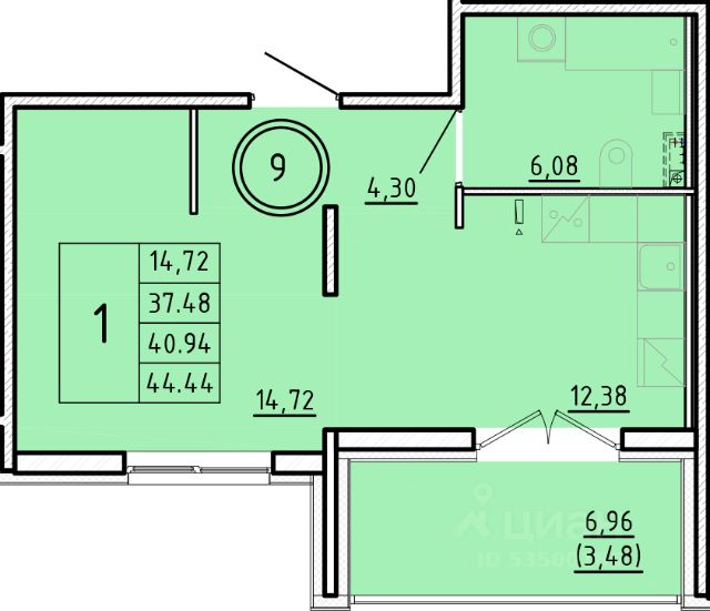 Продаётся 1-комнатная квартира в строящемся доме (Дом 3), срок сдачи: III-кв. 2026, общей площадью 37.48 кв.м., на 1 этаже.