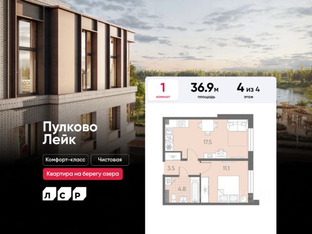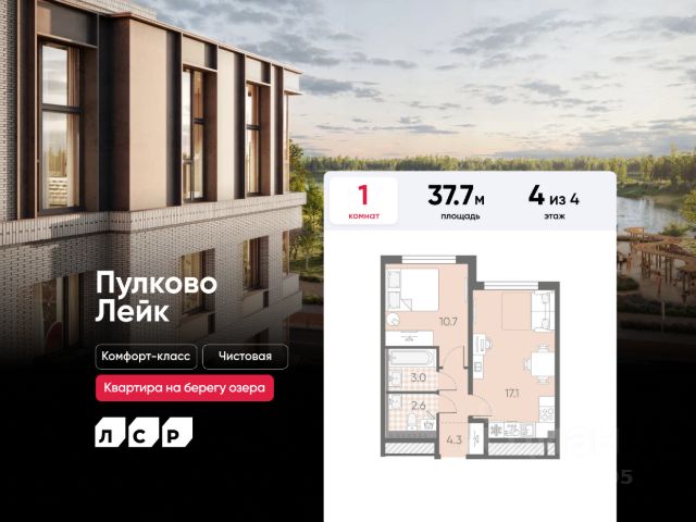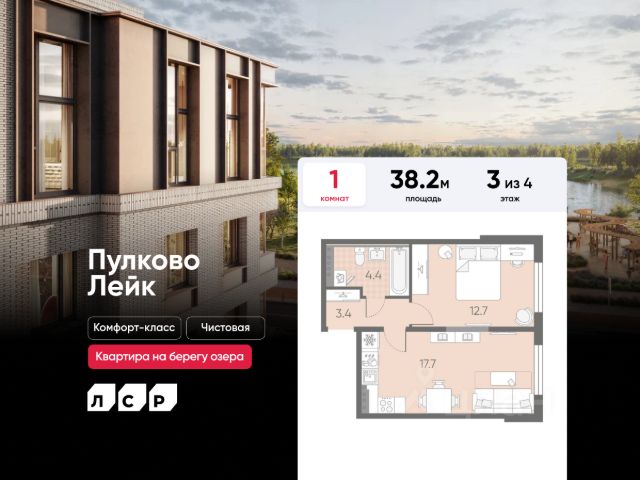 Цена действует при 100% оплате и на определенные ипотечные программы. Подробности — в отделе продаж по телефону. Продается 1-комнатная квартира в ЖК "Пулково Лейк" на 1 этаже. Общая площадь составляет 38.00 кв. м. Квартира с чистовой отделкой. Жилой комплекс "Пулково Лейк" располагается по адресу Санкт-Петербург, Московский. Пулково Лейк - проект малоэтажной застройки на берегу озера на границе Московского и Пушкинского районов. Школа, детские сады, парк на берегу озера и выезды на Пулковское и Петербургское шоссе. Расположение: • 5 мин на авто до Аэропорта Пулково; • 10 мин на авто до станций метро "Московская; • 10-15 мин на авто до городов Пушкина, Павловска и Гатчины; • 20 мин на авто до центра Санкт-Петербурга. В рамках проекта будет построена современная школа на 925 мест и 2 детских сада на 160 и 240 мест, выезды на Пулковское и Петербургское шоссе, а также храм рядом со сквером "Пулковский рубеж". Общественное пространство вдоль берега озера превратится во всесезонный парк, в котором найдется место для любых активностей от пробежек, катания на САПах и велосипедах до отдыха в шезлонгах и любования закатом солнца. Зимой будет работать каток, проложен лыжный маршрут, предусмотрено место для новогодней елки и горок для детей. Для Ваших питомцев - площадка для выгула собак. Преимущества ЖК: • Малоэтажный квартал с благоустроенным променадом. Комфортная городская жизнь в окружении озера и Пулковских высот. • Уникальные опции. Собственные патио на первом этаже, планировки с каминами и спа-зоной, двухуровневые и двухэтажные квартиры. • Удобное расположение в Московском районе. Аэропорт "Пулково", Экспофорум, царские пригороды Петербурга и выезд на КАД - от 7 до 20 минут на авто. • Образовательные возможности для ваших детей. Успейте приобрести квартиру на выгодных условиях! Чтобы узнать подробности, обращайтесь за консультацией по телефону.