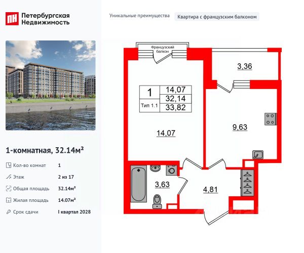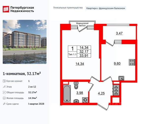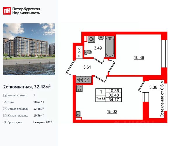 Продается уютная 1-комнатная квартира от застройщика в жилом комплексе "Сэтл Ривьера" в активно развивающимся Невском районе. До метро можно добраться на транспорте всего за 10 минут. Удобная, классическая, функциональная европланировка, большая кухня-гостиная 15.07 м², вместительная прихожая 4 м². Общая площадь квартиры - 33.08 м², жилая 10.21 м², высота потолка 2.77 м. Квартира продается с отделкой "Норд Лайн светлый плюс". Что особенного в ЖК "Сэтл Ривьера"? • Первая береговая линия Невы. 5 км до центра Петербурга • "Активити парк" - пространство для занятий спортом и отдыха. "Ривьера парк" с променадом и панорамной ротондой • Масштабные дворы 10 000 кв.м. с авторским ландшафтным дизайном • Двухуровневые единые входные группы • Видовые квартиры с террасами, каминами и саунами