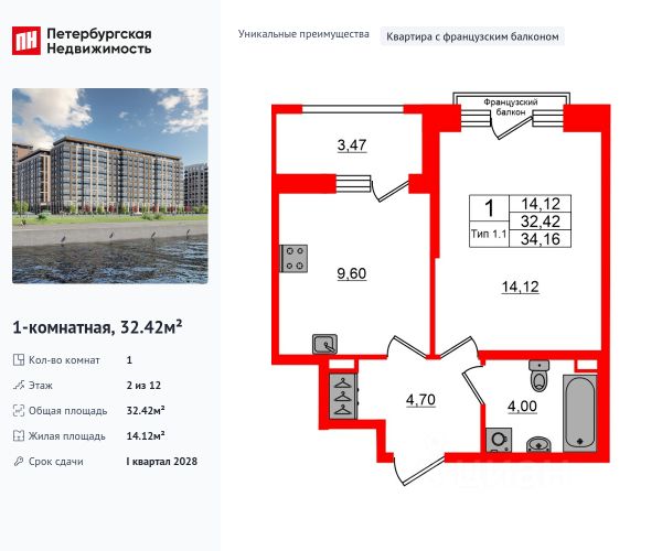 Продается уютная 1-комнатная квартира от застройщика в жилом комплексе "Setl Ривьера" в активно развивающимся Невском районе. До метро можно добраться на транспорте всего за 10 минут. Французский балкон придает особенный европейский шик комнате. Уникальная планировка, кухня 9.6 м², просторная прихожая 4.7 м². Общая площадь квартиры - 32.42 м², жилая 14.12 м², высота потолка 2.77 м. Квартира продается с отделкой "Норд Лайн серый плюс". Что особенного в ЖК "Setl Ривьера"? • Первая береговая линия Невы. 5 км до центра Петербурга • "Активити парк" - пространство для занятий спортом и отдыха. "Ривьера парк" с променадом и панорамной ротондой • Масштабные дворы 10 000 кв.м. с авторским ландшафтным дизайном • Двухуровневые единые входные группы • Видовые квартиры с террасами, каминами и саунами