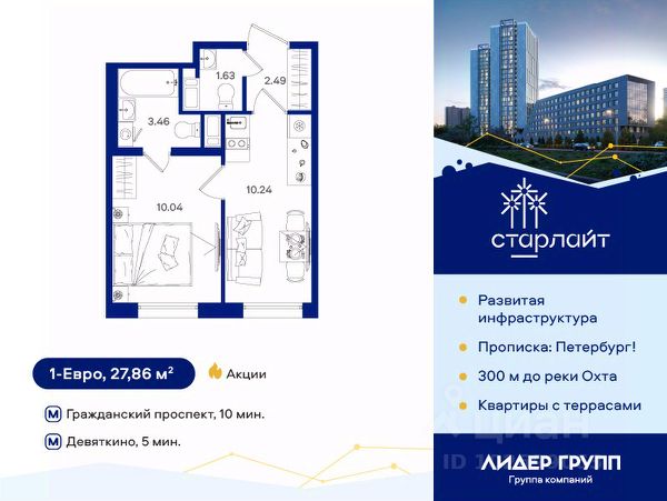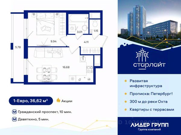 - Удачная двусторонняя планировка, в которой выделена зона кухни-гостиной и спальни (при желании, вы сможете преобразовать апартамент в полноценную однокомнатную квартиру).