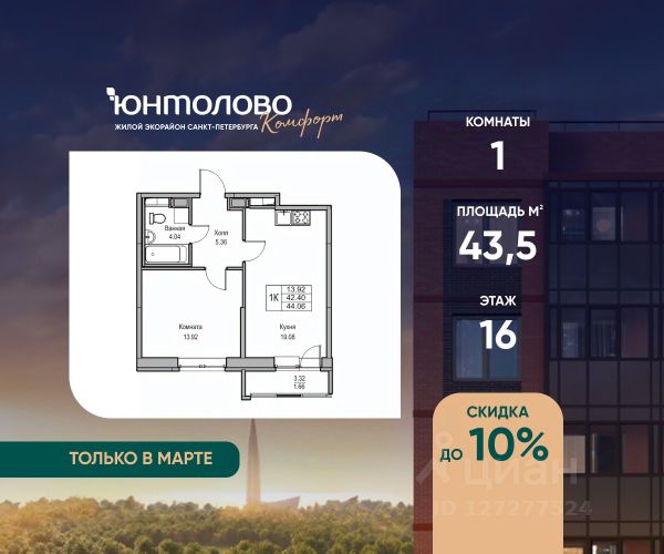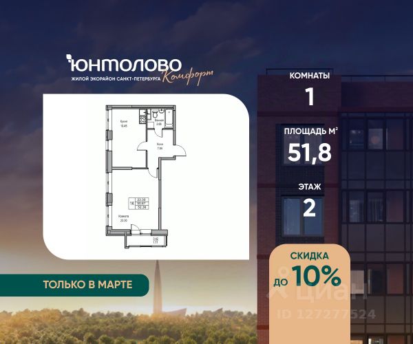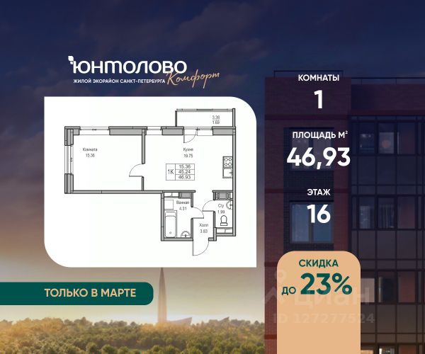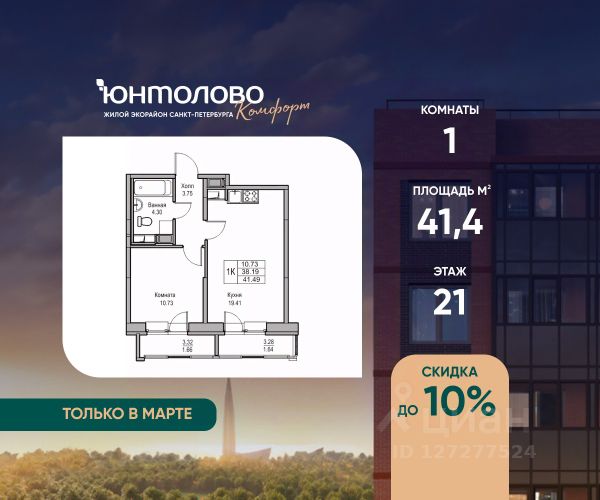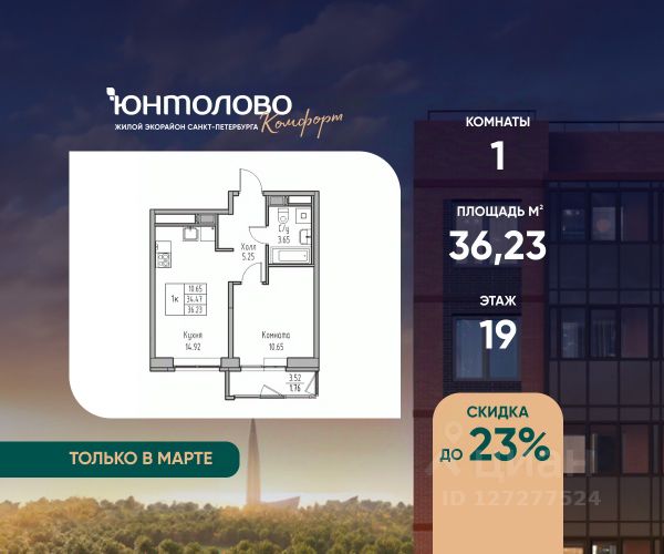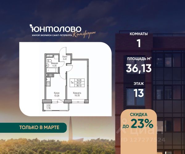 Продаeтся 1-к квартира 38.81 кв.м. экорайона "Юнтолово" (Приморский р-н) напрямую от застройщика "Главстрой Санкт-Петербург". Доступны льготная ипотека, рассрочка, трейд-ин и спецпредложения. О проекте Жилой экорайон "Юнтолово" расположен в престижном Приморском районе, в живописной зелёной зоне недалеко от Юнтоловского заказника. На участке площадью 437 га планируется около 2,2 млн кв. м жилья с образовательной, медицинской, торговой, деловой инфраструктурой и общественными пространствами. Настоящее сердце "Юнтолово" — Центральный парк площадью 20 гектаров. Главная идея экорайона — близость к настоящей природе в черте города. Расположение и транспортная доступность Тишина и зелёное окружение района сочетаются с городской инфраструктурой и удобной логистикой. Остановки общественного транспорта до метро "Беговая", "Старая Деревня", "Комендантский проспект" и "Чёрная речка" в шаговой доступности. Близость КАД, ЗСД и Приморского шоссе обеспечивает быстрый выезд в центр, Курортный район и другие части города. Инфраструктура В парк-квартале "Юнтолово" создана вся необходимая социальная и коммерческая инфраструктура. Для детей открыты 4 современных детских сада и 2 школы. На первых этажах работают кафе и пекарни, магазины, аптеки, салоны красоты, МФЦ, почта России, развивающие центры для детей и другие сервисы. Для отдыха и спорта Особое внимание уделено качеству общественных пространств, формирующих среду для отдыха, общения и активного образа жизни. Для маленьких жителей организованы детские площадки с игровыми комплексами для всех возрастных групп. Для активного отдыха — уличные тренажёры, футбольные, волейбольные и баскетбольные поля, йога-зона, велодорожки, беговые маршруты и скейт-парк. На берегу реки Юнтоловки открыт гребной клуб "ПричалЮ" для любителей сапсёрфинга и гребли. Планировочные решения В "Юнтолово" предусмотрена широкая линейка планировок — от компактных студий 23 м² до семейных четырёхкомнатных квартир до 111 м² с мастер-спальнями, гостевым санузлом и системами хранения. Квартиры сдаются с чистовой отделкой "Комфорт" в светлом и темном решении. Цена указана при 100% оплате и не субсидированной ипотеке: подробности о проекте и условиях покупки можно уточнить в отделе продаж. Продается 1-комнатная квартира 1-комнатных квартир в Юнтолово в Санкт-Петербурге.