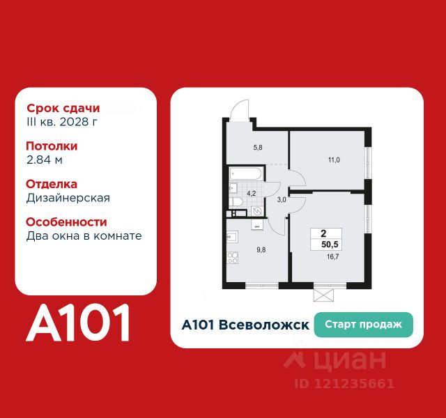 Старт продаж! 2-комнатная квартира площадью 51.50 в ЖК "А101 Всеволожск" на 8 этаже. Квартира без отделки. Вид из окна на улицу. В квартире 1 санузел. Высота потолков 2.84 м. Предложения от застройщика на январь 2026: - Гибкая рассрочка 20 000 руб/мес. и первым взносом 10%. ОТДЕЛКА Квартира передается без отделки. Благодаря тому, что в данном типе отделки стены не возводятся, вы сможете создать удобную планировку и самостоятельно организовать зонирование комнат. ПАРАДНАЯ. В каждой парадной предусмотрены места для хранения велосипедов и колясок, гостевой санузел и удобная зона ожидания для гостей. ДВОРЫ И ОКРУЖЕНИЕ. Просторные дворы свободны от машин и закрыты от посторонних. Предусмотрен подземный паркинг с возможностью спуститься из дома на -1 этаж и машиноместа с зарядными станциями для электромобилей. Большую часть комплекса займут благоустроенные зелёные зоны, теневые сады и городские общественные пространства с развитой тротуарной сетью и велодорожками. Каждый дом оборудован системами видеонаблюдения и контроля доступа. Не хватает средств на покупку кладового помещения? Оформите ипотеку на квартиру и добавьте к ней часть стоимости кладовой. ЗАСТРОЙЩИК ГК "А101" - крупный инвестиционно-строительный холдинг, занимает 6-е место по объему строительства в России (по данным "Единого ресурса застройщиков" на 2023 год). НКР присвоило ГК "А101" кредитный рейтинг A+.ru, подтверждая его надежность и финансовую устойчивость для завершения строительства ЖК. 2-комнатная квартира, примерная площадь 50 м2 в Всеволожске.