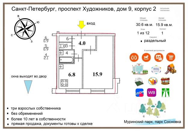 Риелторам: огромная просьба не беспокоить! Пожалуйста, не звоните и не пишите. Услуги (платные и бесплатные) не требуются. Спасибо за понимание! Продаётся 46 кв. м (с лоджией — 49,9 кв. м) по адресу: Сантьяго-де-Куба, 8к2, 2-й этаж. Один взрослый собственник, без детей, без обременений, долгов и так далее. Все документы готовы к сделке. Объект с многолетней семейной историей — квартира принадлежала нашей семье практически с момента постройки дома. Продажа в связи с переездом в частный дом. Вся мебель, техника и декор остается новым покупателем. Квартира светлая, просторная, все комнаты раздельные, окна выходят на уютный сквер без машин. Дом удален от улиц так как находится во внутренней части массива - ни шума, ни выхлопов, ни пыли. Хорошее ТСЖ, готовое ответить на все вопросы. Подъезды чистые, уборку проводят вовремя, мусор увозят. Установлены камеры в парадной и у каждого подъезда во всём доме. Очень развитая инфраструктура: - В 70 м — современный фитнес-центр с бассейном; - В пешей доступности — ТЦ Родео Драйв с аквапарком и ТЦ Сосновский; - 5 мин до остановки (автобус/трамвай), 1015 мин на транспорте до метро (Озерки, Проспект Просвещения, Политехническая); - Близко к КАД; - 57 мин до парков Сосновка и Муринский парк, а также до Суздальских озёр с пляжем; - Много скверов, детских площадок, магазинов, аптек, садов, школ и техникумов рядом. 2-комнатная квартира от хозяина на улице Сантьяго-де-Куба в Санкт-Петербурге, частное объявление.