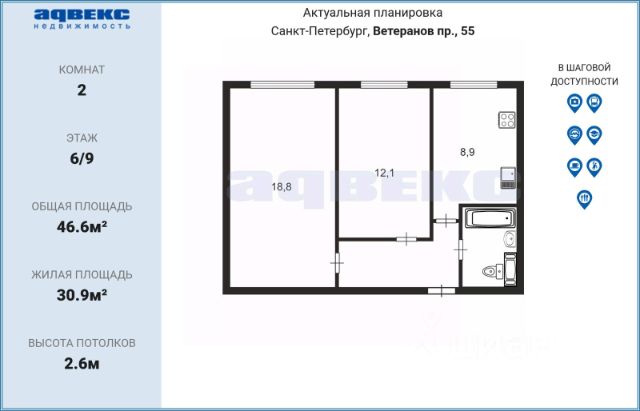 Общая площадь квартиры 46,6 кв.м., жилая (18,8+12,1)кв.м, комнаты изолированы, кухня 8,9 кв.м, санузел совмещен, прихожая 3,6 кв.м.. Окна выходят на пр. Ветеранов, из них виден парк Александрино. В летний и осенний период этот вид завораживает. Вход в парадную со двора, территория дома огорожена, охраняется и находится под видеонаблюдением. В парадных установлен новый домофон, сделан косметический ремонт, везде чистота и порядок. Можно подключиться к камере домофона и с телефона наблюдать территорией