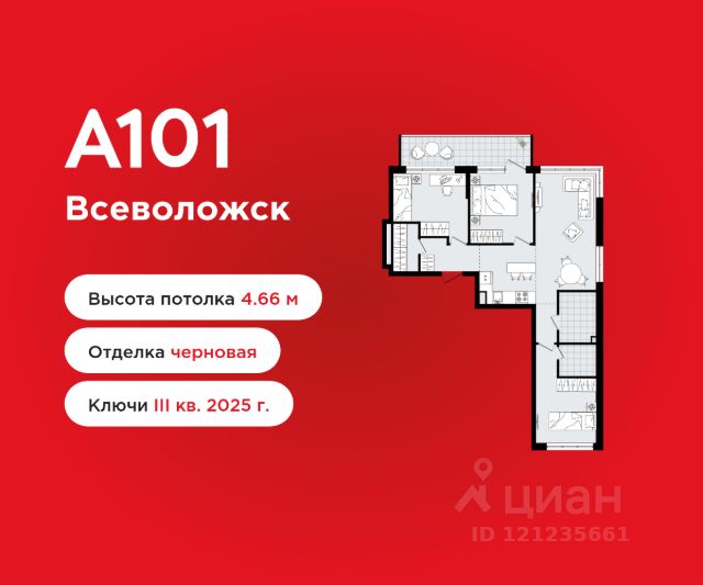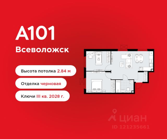 2-комнатная квартира площадью 56.80 в ЖК "А101 Всеволожск" на 4 этаже. Квартира без отделки. Вид из окна на улицу. В квартире 1 санузел. Высота потолков 2.84 м. ОТДЕЛКА Квартира передается без отделки. Благодаря тому, что в данном типе отделки стены не возводятся, вы сможете создать удобную планировку и самостоятельно организовать зонирование комнат. ДВОРЫ И ОКРУЖЕНИЕ Большая часть территории комплекса отведена под зелёные благоустроенные зоны: теневые сады, уютные городские пространства с развитой тротуарной сетью и велодорожками - всё для вашего активного и здорового образа жизни. Внутренние дворы закрыты от посторонних и свободны от автомобилей. Каждый дом оснащён высокотехнологичными системами видеонаблюдения и контроля доступа, обеспечивая максимум безопасности и спокойствия для вас и ваших близких. Окружение района - живописный природный ландшафт. Всего в 5 минутах ходьбы располагается Ковалёвский лесопарк - источник кислорода, пространство для спорта, отдыха и приятных прогулок на свежем воздухе. ПАРАДНАЯ Мягкая мебель, живые растения и натуральные материалы в отделке формируют современный и уютный интерьер входной группы, радующий глаз и создающий приятную атмосферу для встреч с гостями. Для вашего удобства реализован безбарьерный вход, отвечающий требованиям доступной среды для всех жильцов, а также в каждой парадной имеется отдельное помещение для хранения колясок и велосипедов. ИНФРАСТРУКТУРА: В жилой застройке сохранена естественная среда благодаря разнообразию растительности, извилистым дорожкам и уличной мебели из натуральных материалов. Здесь находится насыщенная сеть экотроп протяжённостью более 10 км прямо у дома, а просторная площадь позволяет жителям приятно провести время, общаться с соседями и отдыхать. Также предусмотрены зоны для отдыха и специально оборудованные спортивные площадки для активного образа жизни на свежем воздухе. На территории района ГК "А101" создает современный учебно-образовательный кластер, В "А1О1 Всеволожск" предусмотрена современная школа на 1300 учеников и 2 детских сада Всё самое необходимое - рядом с вашим домом. Выпить утром кофе в уютном кафе или поужинать с друзьями, отвести детей на развивающие занятия или игровую площадку, купить продукты и товары первой необходимости. В проекте запланировано уникальное гастрономическое пространство, располагающееся на основном пешеходном бульваре жилого района. Территория дополнительно оборудована местами отдыха на свежем воздухе, а для ресторанов и кафе будет предусмотрена возможность организации летних веранд. ЗАСТРОЙЩИК: ГК "А101" - один из крупнейших застройщиков России. Каждая восьмая квартира, проданная в Москве, находится в районе, построенном компанией, что подчеркивает её значимость и успех на рынке недвижимости.