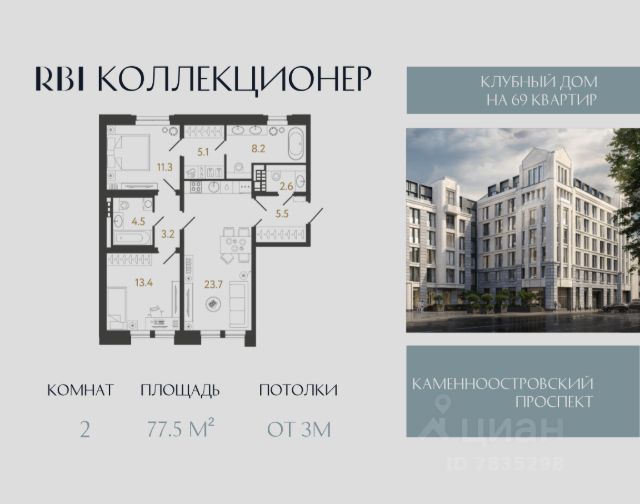 "Коллекционер" — клубный дом от RBI на 69 коллекционных квартир с террасами и люкарнами в Петроградском районе Петербурга на улице Чапыгина. Здесь роскошь пустоты и камерного уединения, воплотившаяся в модернистской архитектуре с элементами ар-деко, рождает новые вечные смыслы. Окружение располагает: среди роскошных доходных домов XIX века и уютных садов Петроградской стороны, которые хранят память былых столетий, пробуждается особое внутреннее стремление создавать новое, неподвластное времени. Средняя площадь квартир в проекте — 85,3 м². В коллекционной квартирографии выделяются исключительные лоты: 9 квартир с люкарнами и террасами, 4 из которых — двухуровневые, 2 из них — с двусветной гостиной и потолками до 6,4 м. В башнях-доминантах, которые проглядываются с Каменноостровского проспекта, ещё две уникальные квартиры: здесь потолки в кухне-гостиной достигают высоты 3,75 м. Все квартиры продаются без отделки. Окна и балконы — алюминиевые с накладками из натурального дерева внутри квартиры. Со стороны улицы Чапыгина коллекционеров и их гостей встречает парадный курдонёр с лаунж-зоной на открытом воздухе. Войдя в дом, вы попадаете в роскошное лобби, где за изящной стойкой ресепшн вас приветствует хостес. В центральной входной группе предусмотрели кофепоинты — чтобы в уютной зоне ожидания вы могли пообщаться с подругой за чашечкой свежесваренного эспрессо. Для деловых переговоров и интеллектуальных дискуссий — переговорные комнаты, которые может забронировать каждый из жителей. Направляясь из лобби во вторую секцию дома "Коллекционер", вы попадаете в анфиладную галерею в духе античной пинакотеки. Здесь каждый день вы можете вдохновляться глубокими акварелями Латифа Казбекова и скульптурными симфониями Виктора Грачёва — пространство healing arts у вас дома. Чтобы вы могли наполняться энергией и созерцать природную гармонию в приватной обстановке, во внутреннем дворе обустроили двухуровневое патио. Здесь, среди горных сосен, изысканных гортензий и клёнов, предусмотрели всё для зарождения вашей новой коллекции впечатлений: беседки под навесом — для сосредоточенной работы, уединённые лаунжи — для камерного общения и отдыха, качели-гнёзда за живой изгородью — для погружения в глубину своих мыслей, игровые площадки от Richter RUS — для счастливого детства ваших детей. Извилистые грунтовые дорожки ассоциируются с дворцово-парковыми ансамблями пригородов Петербурга и деликатной роскошью императорских резиденций. На всей территории сада — свободный Wi-Fi. Попасть сюда могут только жители по электронному цифровому ключу. Для жителей оборудуют подземный паркинг на 57 м/м, 10 из которых — с зарядкой для электромобилей. На втором этаже предусмотрены кладовые — их всего 45, они докупаются отдельно. "Коллекционер". Ваша коллекция впечатлений