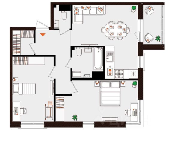 -из комнаты-выход на огромную застекленную отапливаемую лоджию с окнами в пол, куда проведено освещение и установлен теплый пол. Ее можно использовать как кабинет, зону отдыха или место для спортивных занятий;