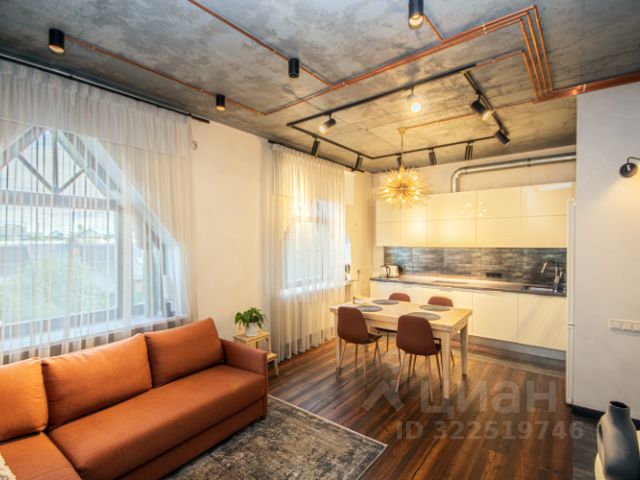 Просторная смарт-гостиная в стиле лофт площадью 25 кв.м объединяет кухню, столовую и зону отдыха для уютных семейных вечеров с просмотром фильмов, вкусными ужинами или активной деятельностью.