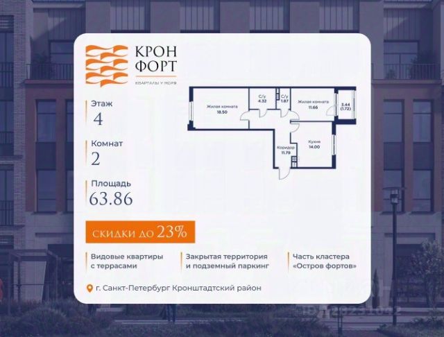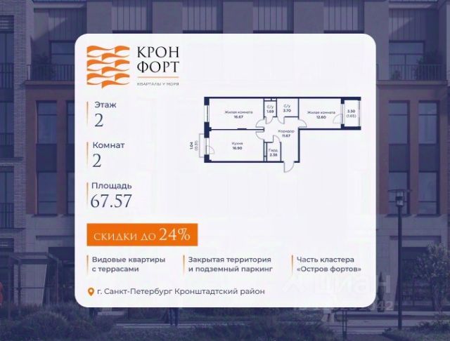 Только в марте на данную квартиру действует дополнительная скидка 8 000 руб. с кв.м. Стоимость квартиры в объявлении указана со скидкой 21%. Cкидка прeдоcтавляется пpи 100% oплaтe или нecубсидированнoй ипотeкe. Возможно повышение скидки до 24%. Подробности уточняйте в отделе продаж. Предлaгaeтся квартира плoщaдью 60.75 кв.м в жилом кoмплексе "Kронфoрт. Центpальный" в Санкт-Петeрбурге (Кронштадт). Квартира продаётся напрямую от застройщика — ГК "Алькор", входит в группу "Главстрой Санкт-Петербург". Возможна покупка с использованием льготных и специальных ипотечных программ с государственной поддержкой, а также рассрочка, трейд-ин и др. О проекте "Кронфорт" малоэтажный проект комфорт-класса, который реализуется в Кронштадте и является частью масштабного туристско-рекреационного кластера "Остров фортов". Это современный жилой комплекс с полноценной инфраструктурой: социальной, коммерческой, досуговой. Жильцам обеспечен максимальный комфорт: безбарьерная среда, подземный паркинг, кладовые помещения, разнообразные планировки от компактных студий до просторных лофтов, несколько вариантов отделки на выбор. Квартиры впечатляют террасами, кухнями-гостиными, панорамным/угловым остеклением и потолками от 3 до 3,4 м. Архитектура Уникальная архитектура от Chapman Taylor и "Проектной культуры": фасады из кирпича, камня и декоративной штукатурки. Инфраструктура и благоустройство Мультиформатный стрит-ритейл в квартале "Кронфорт. Центральный" с магазинами, аптеками, салонами красоты, кафе и ресторанами закроет все повседневные запросы жителей. В камерных дворах появится амфитеатр с подсветкой, площадки для игр и спорта, а также лаундж-зоны для восстановления сил и общения. Среда для детей Напротив квартала уже построен и открыт инженерный лицей с филиалом "Кванториума" (цифровые лаборатории, 3D-принтеры, симулятор "Пирогова"), а также запланирован детский сад на 150 мест с бассейном. Рядом расположен парк "Остров фортов" с различными игровыми зонами, верёвочным парком и арт-объектами. Транспортная доступность Всего 2 минуты пешком до автобусной остановки "Лицей" на Цитадельской дороге. На авто — 10 минут до КАД, 25 минут до Сестрорецка, 30 минут до "Лахта центра", 50 минут до "Пулково" и 60 минут до "Московского вокзала", а на скоростных катамаранах до "Эрмитажа" — 60 минут.