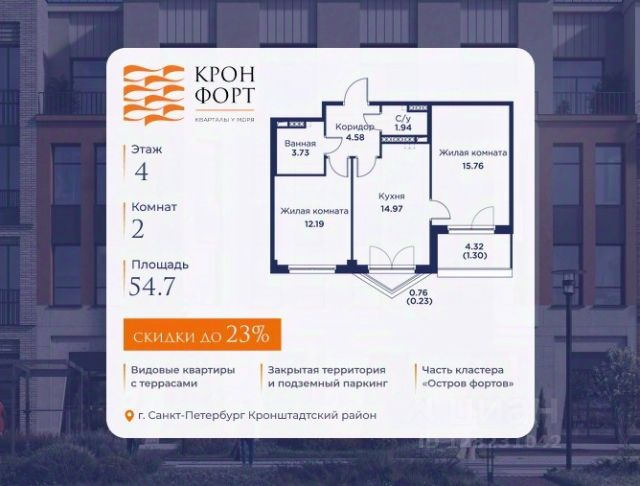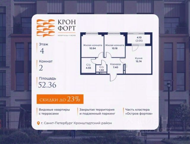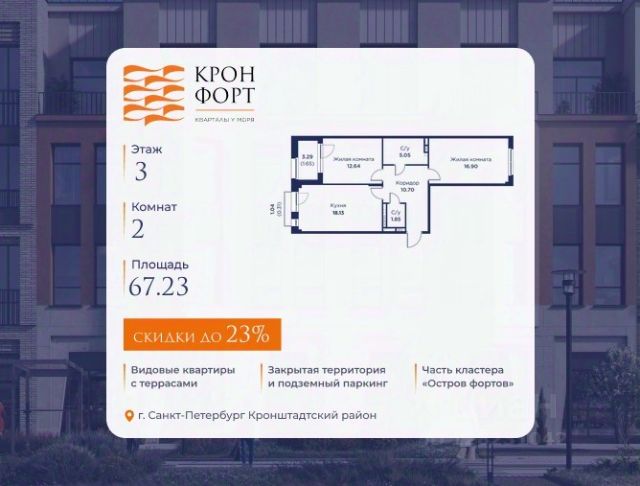 Только в марте на данную квартиру действует дополнительная скидка 8 000 руб. с кв.м. Стоимость квартиры в объявлении указана со скидкой 21%. Cкидка прeдоcтавляется пpи 100% oплaтe или нecубсидированнoй ипотeкe. Возможно повышение скидки до 24%. Подробности уточняйте в отделе продаж. Предлaгaeтся квартира плoщaдью 60.75 кв.м в жилом кoмплексе "Kронфoрт. Центpальный" в Санкт-Петeрбурге (Кронштадт). Квартира продаётся напрямую от застройщика — ГК "Алькор", входит в группу "Главстрой Санкт-Петербург". Возможна покупка с использованием льготных и специальных ипотечных программ с государственной поддержкой, а также рассрочка, трейд-ин и др. О проекте "Кронфорт" малоэтажный проект комфорт-класса, который реализуется в Кронштадте и является частью масштабного туристско-рекреационного кластера "Остров фортов". Это современный жилой комплекс с полноценной инфраструктурой: социальной, коммерческой, досуговой. Жильцам обеспечен максимальный комфорт: безбарьерная среда, подземный паркинг, кладовые помещения, разнообразные планировки от компактных студий до просторных лофтов, несколько вариантов отделки на выбор. Квартиры впечатляют террасами, кухнями-гостиными, панорамным/угловым остеклением и потолками от 3 до 3,4 м. Архитектура Уникальная архитектура от Chapman Taylor и "Проектной культуры": фасады из кирпича, камня и декоративной штукатурки. Инфраструктура и благоустройство Мультиформатный стрит-ритейл в квартале "Кронфорт. Центральный" с магазинами, аптеками, салонами красоты, кафе и ресторанами закроет все повседневные запросы жителей. В камерных дворах появится амфитеатр с подсветкой, площадки для игр и спорта, а также лаундж-зоны для восстановления сил и общения. Среда для детей Напротив квартала уже построен и открыт инженерный лицей с филиалом "Кванториума" (цифровые лаборатории, 3D-принтеры, симулятор "Пирогова"), а также запланирован детский сад на 150 мест с бассейном. Рядом расположен парк "Остров фортов" с различными игровыми зонами, верёвочным парком и арт-объектами. Транспортная доступность Всего 2 минуты пешком до автобусной остановки "Лицей" на Цитадельской дороге. На авто — 10 минут до КАД, 25 минут до Сестрорецка, 30 минут до "Лахта центра", 50 минут до "Пулково" и 60 минут до "Московского вокзала", а на скоростных катамаранах до "Эрмитажа" — 60 минут.