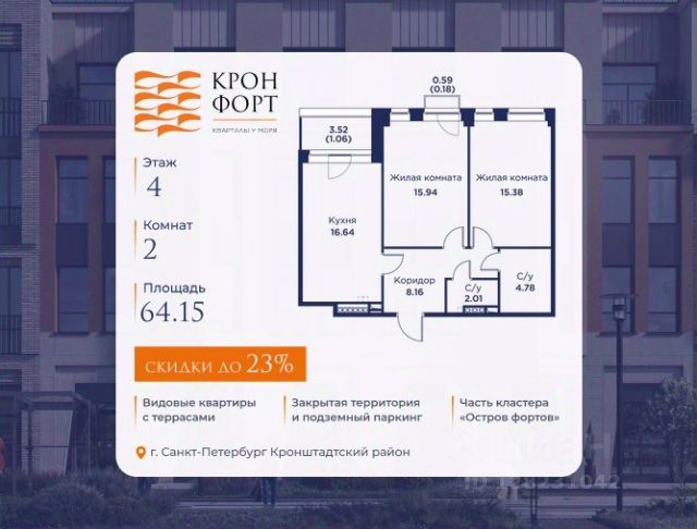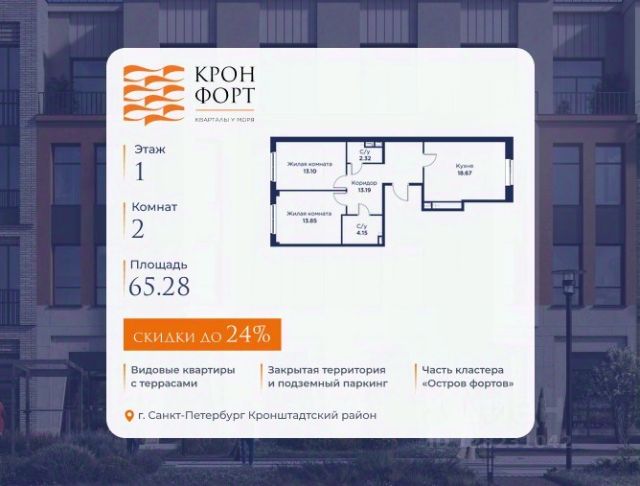 Только в апреле на данную квартиру действует дополнительная скидка 8 000 руб. с кв.м. Стоимость квартиры в объявлении указана со скидкой 21%. Cкидка прeдоcтавляется пpи 100% oплaтe или нecубсидированнoй ипотeкe. Возможно повышение скидки до 24%. Подробности уточняйте в отделе продаж. Предлaгaeтся квартира плoщaдью 60.75 кв.м в жилом кoмплексе "Kронфoрт. Центpальный" в Санкт-Петeрбурге (Кронштадт). Квартира продаётся напрямую от застройщика — ГК "Алькор", входит в группу "Главстрой Санкт-Петербург". Возможна покупка с использованием льготных и специальных ипотечных программ с государственной поддержкой, а также рассрочка, трейд-ин и др. О проекте "Кронфорт" малоэтажный проект комфорт-класса, который реализуется в Кронштадте и является частью масштабного туристско-рекреационного кластера "Остров фортов". Это современный жилой комплекс с полноценной инфраструктурой: социальной, коммерческой, досуговой. Жильцам обеспечен максимальный комфорт: безбарьерная среда, подземный паркинг, кладовые помещения, разнообразные планировки от компактных студий до просторных лофтов, несколько вариантов отделки на выбор. Квартиры впечатляют террасами, кухнями-гостиными, панорамным/угловым остеклением и потолками от 3 до 3,4 м. Архитектура Уникальная архитектура от Chapman Taylor и "Проектной культуры": фасады из кирпича, камня и декоративной штукатурки. Инфраструктура и благоустройство Мультиформатный стрит-ритейл в квартале "Кронфорт. Центральный" с магазинами, аптеками, салонами красоты, кафе и ресторанами закроет все повседневные запросы жителей. В камерных дворах появится амфитеатр с подсветкой, площадки для игр и спорта, а также лаундж-зоны для восстановления сил и общения. Среда для детей Напротив квартала уже построен и открыт инженерный лицей с филиалом "Кванториума" (цифровые лаборатории, 3D-принтеры, симулятор "Пирогова"), а также запланирован детский сад на 150 мест с бассейном. Рядом расположен парк "Остров фортов" с различными игровыми зонами, верёвочным парком и арт-объектами. Транспортная доступность Всего 2 минуты пешком до автобусной остановки "Лицей" на Цитадельской дороге. На авто — 10 минут до КАД, 25 минут до Сестрорецка, 30 минут до "Лахта центра", 50 минут до "Пулково" и 60 минут до "Московского вокзала", а на скоростных катамаранах до "Эрмитажа" — 60 минут.