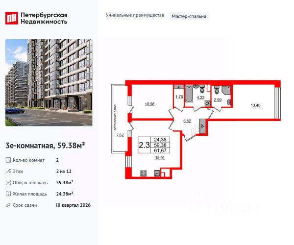 Продается уютная 2-комнатная квартира от застройщика в жилом комплексе "Титул в Московском" в престижном Московском районе. До метро можно добраться пешком всего за 25 минут. Мастер-спальня с собственной ванной комнатой. Самое приватное пространство в вашей квартире. Уникальная, функциональная европланировка, большая кухня-гостиная 17.22 м², вместительная прихожая 6.97 м². Общая площадь квартиры - 60.6 м², жилая 26.83 м², высота потолка 2.77 м. Квартира продается с отделкой "NORD LINE WHITE ВК". Что особенного в ЖК "Титул в Московском"? • Престижный Московский район • Авторская архитектурная концепция • 2 центральные входные группы с ресепшн и лаундж-зонами • Кленовая аллея с арт-стеллой, цветочная аллея и сад трав • Уютные дворы-патио, площадки SetlKids и SetlSport • Инновационный Лицей Setl с оригинальной архитектурной концепцией и уникальной образовательной средой Продам 2-комнатную квартиру, подойдёт для элитной жизни на улице Кубинская в Санкт-Петербурге.