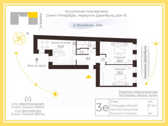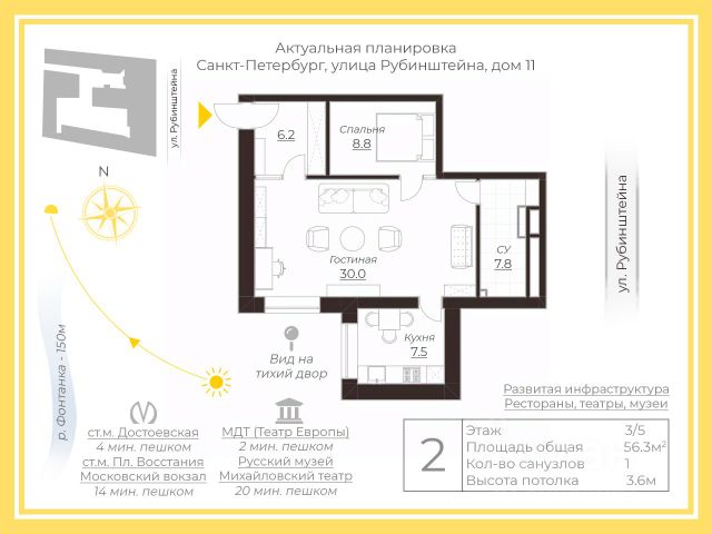 Инфраструктура района — это идеальный баланс уюта и динамики. В пешей доступности супермаркеты, кафе, рестораны, детские сады, школы, гимназии, поликлиники и банки. Культурная жизнь бурлит: всего несколько минут до БДТ им. Товстоногова, Александрийского театра, ТЮЗа, Владимирского собора, Театра Ленсовета, океанариума. Три станции метро — Достоевская, Владимирская и Звенигородская — в 10 минутах ходьбы, что делает передвижения по городу быстрым и удобным.