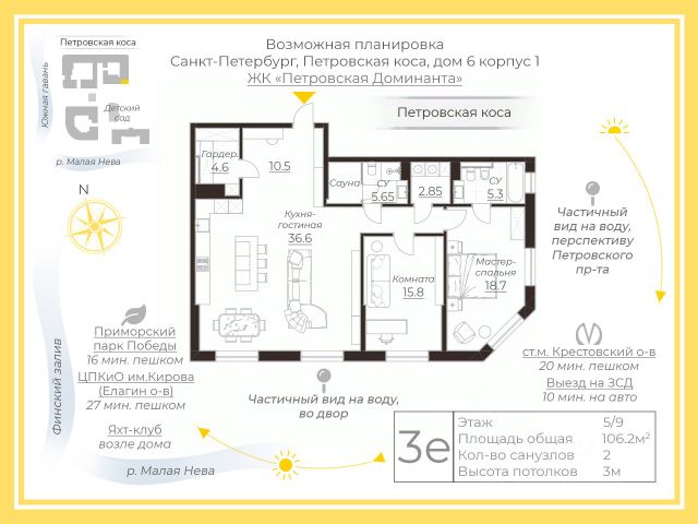 Дорогой покупатель, возможно, это Ваша квартира у воды. Новый жилой комплекс премиум класса Петровская Доминанта расположен на Петровском острове на берегу Малой Невы у яхт клуба в парковой зоне, вдали от шумных улиц. Ближайшая станция метро Крестовский остров в 1,5 км. Комплекс оснащен всем необходимым для современной жизни: кафе, рестораны, магазины, салоны, мастерские, детский сад, прогулочные зоны, оборудованные площадки. Самое главное здесь - безопасность, свежий воздух, тишина, спокойствие в сочетании с высоким качеством и функциональностью.