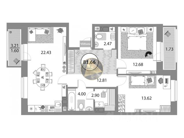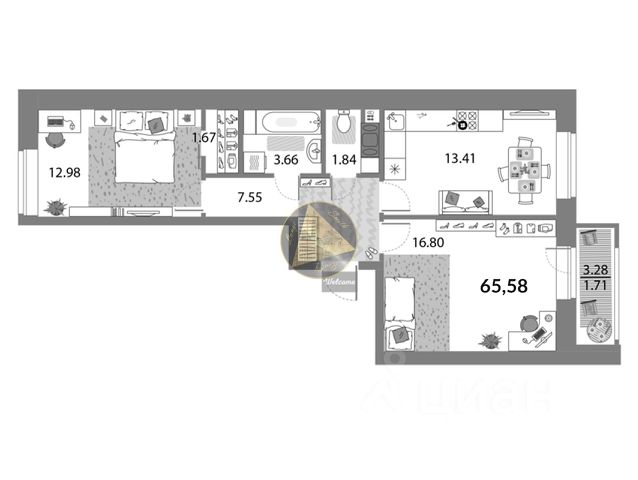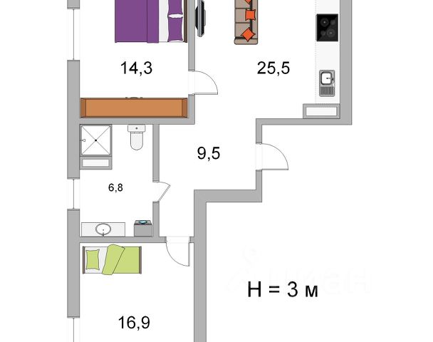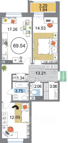 -Редкая и самая комфортная планировка, окна выходят на две стороны (спальня-во двор, гостиная и кухня с балконом на проспект Авиаконструкторов). Все комнаты, кухня, коридор и сан. Узел, правильной и эргономичной формы и квадратуры.