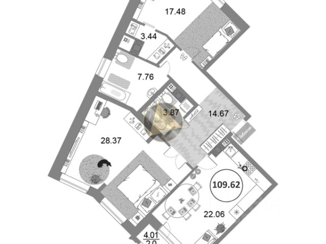*Цвет дивана, дизайн стульев, двери шкафа купе улучшены/отличаются от отраженных на фото проекта.