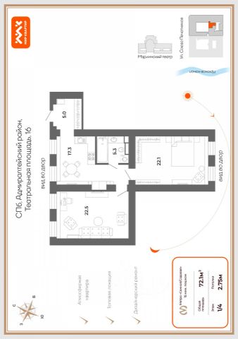 Арт. 113042698 Добрый день, Уважаемый Покупатель! К продаже предлагается просторная двухкомнатная квартира в Центральном районе Санкт-Петербурга с актуальным дизайнерским ремонтом. Локация не нуждается в детальном описании, дом находится на Театральной площади напротив основной сцены Мариинского театра. А это значит: развитая инфраструктура, богатая архитектура и высокая транспортная доступность. Дом был построен в 1875 году архитектором А.И. Кракау в стиле итальянского Возрождения. Ремонт кровли и внутридомовых инженерных сетей был выполнен в 2006-2012 годах. Преимущество квартиры - свой отдельный вход, который осуществляется из тихого мощеного дворика. Предлагаемая к продаже квартира общей площадью 72 кв. метра находится на первом этаже. Пол выполнен со специальной подготовкой для утепления, покрытие - инженерная доска. Двухсторонняя планировка и большое количество окон делают пространство светлым и объемным. Детально продуманный и качественно исполненный дизайн-проект предполагает две изолированные комнаты, совмещенный санузел, вместительную прихожую и функциональную кухню. Вся мебель и техника в квартире новая, предусмотрены различные сценарии освещения во всех зонах, в ванной комнате и в прихожей смонтирован тёплый пол. Ремонт выполнен, разумеется, с заменой всех коммуникаций и инженерных сетей, межкомнатных перегородок, входной двери, окон, радиаторов, есть поэтапная фотофиксация работ. Электрическая мощность увеличена до 15 кВт. С юридической стороны - один взрослый собственник, полная сумма в договоре. Звоните, с удовольствием отвечу на все вопросы и оперативно организую показ. Предлагаем ПРЕМИАЛЬНОЕ обслуживание для требовательных клиентов. Оперативно организуем просмотр, предоставим полную информацию по объекту. 20 лет работы с требовательными клиентами подготовили нас к решению ВАШИХ сложных задач. Будем рады знакомству! Ул. Рубинштейна, д.8. Продам 2-комнатную квартиру элитные на улице Глинки в Санкт-Петербурге.
