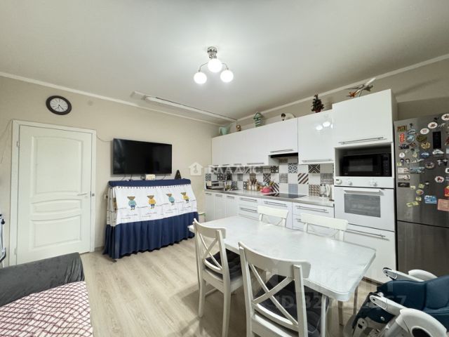 Кухня-гостиная со столовой зоной. Современная кухонная мебель, со встроенным холодильником, посудомоечной машиной, индукционной варочной панелью, и духовым шкафом. (техника проверенных марок Воsсh, Gоrеnjе, АЕG.) Остров с барными стульями. Столешница компакт-плита (hpl столешница). В столовой зоне стол из шпона дуба на 4 персоны с мягкими стульями из массива бука. В зоне гостиной диван-кровать, ТВ 55 дюймов, оформленная ТВ зона с хранением.