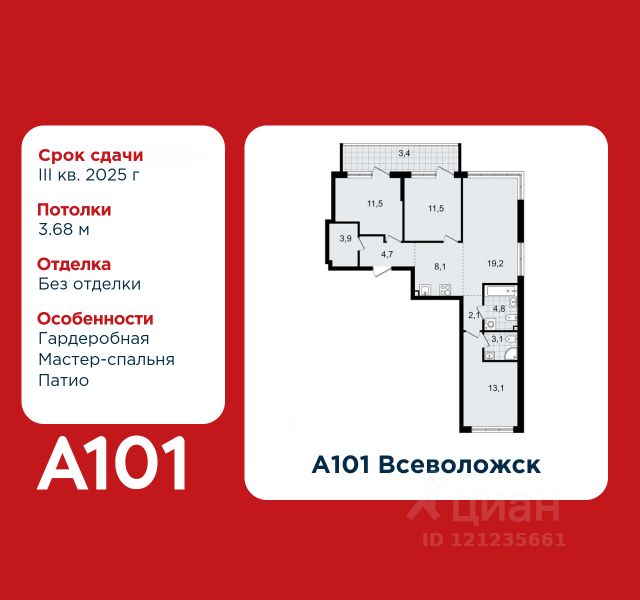2-комнатная квартира площадью 59.00 в ЖК "А101 Всеволожск" c лоджией на 1 этаже. Квартира без отделки. Вид из окна во двор. В квартире 2 санузла. Высота потолков 4.66 м. Особенность планировки - мезонин и патио. Предложения от застройщика на декабрь 2025: - Гибкая рассрочка 20 000 руб/мес. и первым взносом 10%. ОТДЕЛКА Квартира передается без отделки. Благодаря тому, что в данном типе отделки стены не возводятся, вы сможете создать удобную планировку и самостоятельно организовать зонирование комнат. ОСОБЕННОСТИ ПЛАНИРОВКИ Мезонин - полуэтаж с большим количеством естественного света. На втором уровне можно организовать спальню или кабинет. Патио представляет собой небольшой индивидуальный дворик с выходом из квартиры. Это пространство огорожено живой изгородью, накрыто навесом, а пол покрыт бетонной плитой. ПАРАДНАЯ В каждой парадной предусмотрены места для хранения велосипедов и колясок, гостевой санузел, лапамойка (место для мытья домашних животных или колес велосипедов) и удобная зона ожидания для гостей. ДВОРЫ И ОКРУЖЕНИЕ Просторные дворы свободны от машин и закрыты от посторонних. Большую часть комплекса займут благоустроенные зелёные зоны, теневые сады и городские общественные пространства с развитой тротуарной сетью и велодорожками. Каждый дом оборудован системами видеонаблюдения и контроля доступа. Не хватает средств на покупку кладового помещения? Оформите ипотеку на квартиру и добавьте к ней часть стоимости кладовой. ЗАСТРОЙЩИК ГК "А101" - крупный инвестиционно-строительный холдинг, занимает 6-е место по объему строительства в России (по данным "Единого ресурса застройщиков" на 2023 год). НКР присвоило ГК "А101" кредитный рейтинг A+.ru, подтверждая его надежность и финансовую устойчивость для завершения строительства ЖК. Продается 2-комнатная квартира на 1 этаже в Всеволожске.