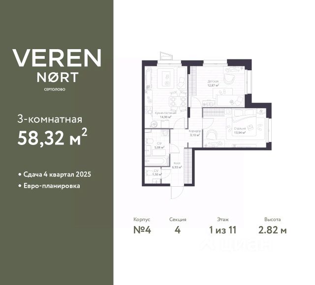 Потолки 3 м. Коридор 12,5 м2 в котором, есть место для хранения вещей.