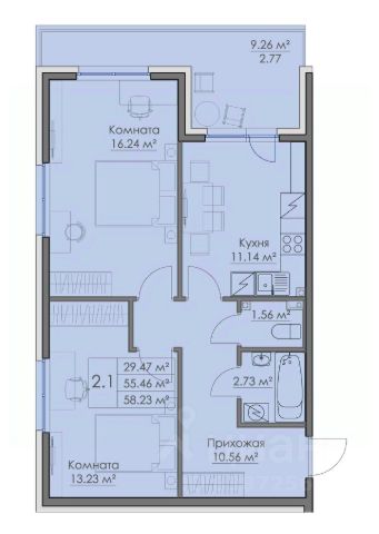 Продаётся 2-комнатная квартира в строящемся доме (Феникс), срок сдачи: I-кв. 2027, общей площадью 56.14 кв.м., на 1 этаже.