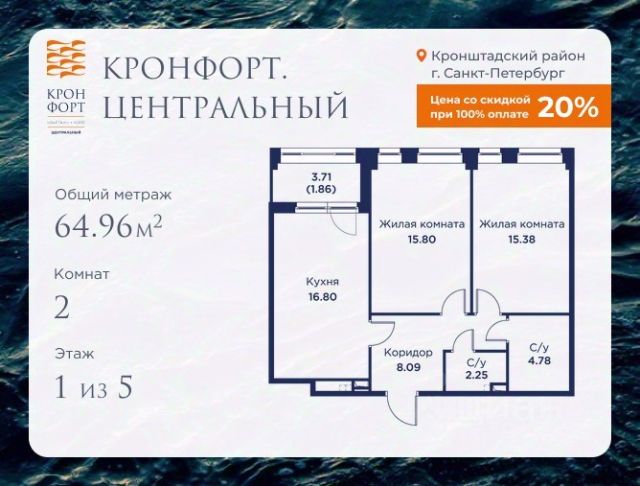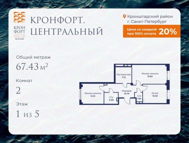 Стоимость квартиры указана со скидкой 20%. Скидка предоставляется при 100% оплате или несубсидированной ипотеке. Предлагается квартира площадью 55.75 кв.м в жилом комплексе "Кронфорт. Центральный" в Санкт-Петербурге (Кронштадт). Возможна покупка с использованием льготных и специальных ипотечных программ с государственной поддержкой. Высота потолков в квартирах — от 3 до 3,4 метров, окна увеличенного размера, есть варианты с эркерами, французскими балконами, лоджиями и террасами. Жилой квартал состоит из пяти четырехэтажных корпусов с закрытыми охраняемыми дворами, свободными от машин. Первые этажи формируют торговые променады в стиле пешеходных улиц исторической части Петербурга и Кронштадта. Внутренние пространства между корпусами — пешеходные зоны с уютными площадями. Архитектурный облик квартала разработан бюро "Проектная культура" и международной компанией Chapman Taylor. Инфраструктура комплекса включает: - Лицей с двумя бассейнами - Детский сад на 150 мест с бассейном и закрытой территорией - Веревочный парк - Игровые площадки для активного отдыха; - Кабинет врача общей практики. - Подземные паркинги с лифтами. - Мусоросборные камеры, индивидуальные кладовые. - Закрытые дворы с контролем доступа и видеонаблюдением. - Мультформатный стрит-ретейл с кафе и ресторанами. - Триатлон-центр и беговые/велодорожки. - Учебно-тренировочный комплекс для детей "Лагерь настоящих героев". Транспортная доступность обеспечивает удобный выезд на КАД (около 1-3 км), 2 минуты пешком до автобусной остановки "Лицей", 25 минут до Сестрорецка, 30 минут до "Лахта-центра", 50 минут до аэропорта "Пулково" и 60 минут до Московского вокзала. Для любителей моря доступен маршрут на "Метеоре" до центра Санкт-Петербурга. Отделка квартир предлагается как с готовой чистовой отделкой, так и со свободной планировкой без отделки для реализации индивидуальных дизайнерских решений. В третьем корпусе, продажи которого стартовали в марте 2025 года, доступны квартиры с просторными террасами, тремя балконами, кухнями-гостиными до 38 кв.м с окнами на две стороны, обеспечивающими панорамное освещение и виды. Если вам нужна помощь с оформлением ипотеки или дополнительная информация по комплексу и условиям покупки, обращайтесь в отдел продаж за консультацией. Купить 2-комнатную квартиру на 1 этаже в Кронштадте.