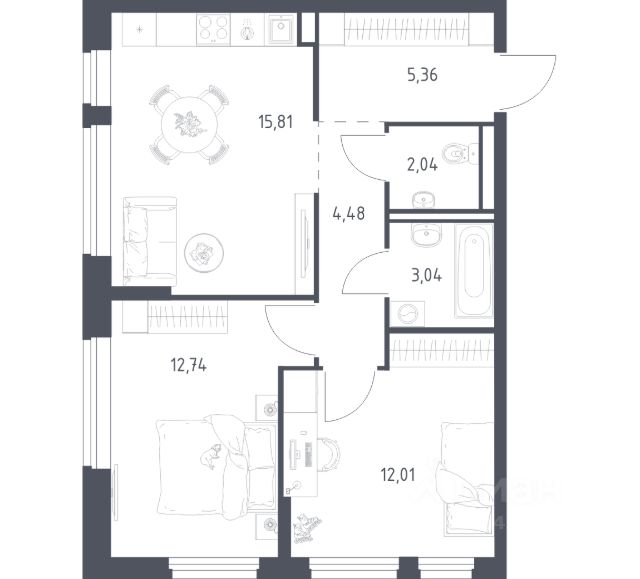 В продаже 2-комнатная квартира в корпусе 39 ЖК 'Живи! В Рыбацком'. Квартира располагается на 1 этаже, общая площадь 49.2 м2.