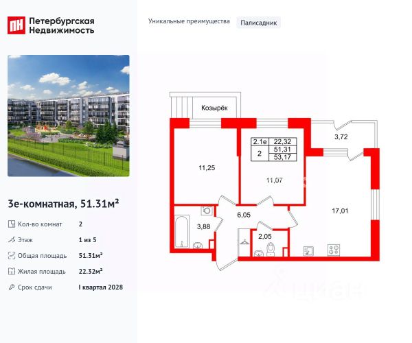 Продается уютная 2-комнатная квартира от застройщика в жилом комплексе "Парадный ансамбль" в престижном Московском районе. До метро можно добраться на транспорте всего за 20 минут. Мастер-спальня с собственной ванной комнатой. Самое приватное пространство в вашей квартире. Уникальная, функциональная европланировка, большая кухня-гостиная 14.61 м², вместительная прихожая 3.61 м². Общая площадь квартиры - 50.66 м², жилая 23.01 м², высота потолка 2.77 м. Квартира продается с отделкой "NORD LINE WHITE". Что особенного в ЖК "Парадный ансамбль"? • Инновационный Лицей Setl с оригинальной архитектурной концепцией и уникальной образовательной средой • Масштабное малоэтажное строительство в престижном Московском районе • Рекреационные зоны: парадный парк в центре квартала, ручей с собственной набережной, центральная площадь, ресторанный комплекс и пешеходный бульвар • Фасады из керамогранита и кирпича с яркими и акцентными входными группами • Две самые большие площадки Setl Kids и Setl Sport • Уникальные квартиры.High Flat на последних этажах, палисадники у квартир на первом этаже, семейные секции, квартиры с саунами и окном в ванной