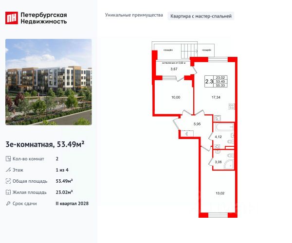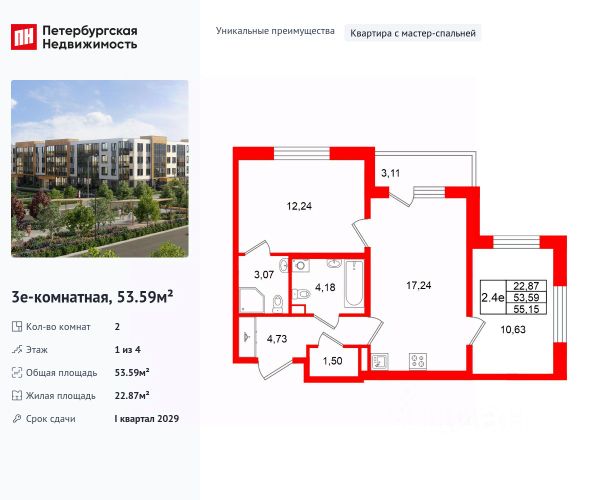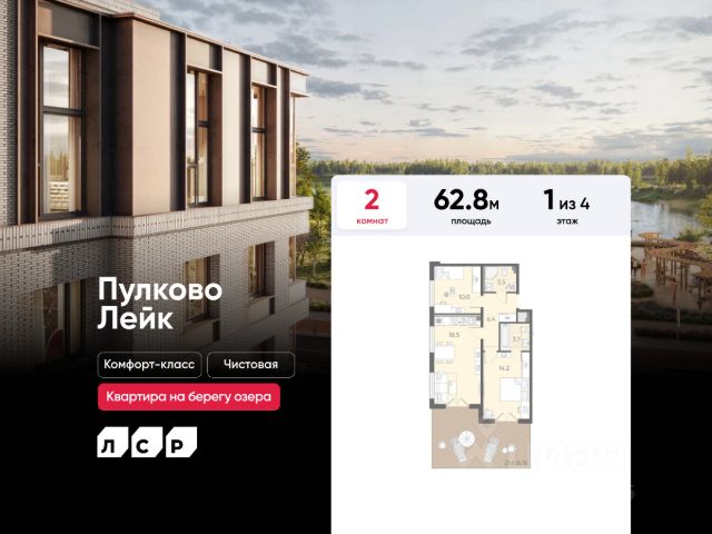 Цена действует при 100% оплате и на определенные ипотечные программы. Подробности — в отделе продаж по телефону. Продается 2-комнатная квартира в ЖК "Пулково Лейк" на 1 этаже. Общая площадь составляет 53.90 кв. м. Квартира с чистовой отделкой. Жилой комплекс "Пулково Лейк" располагается по адресу Санкт-Петербург, Московский. Пулково Лейк - проект малоэтажной застройки на берегу озера на границе Московского и Пушкинского районов. Школа, детские сады, парк на берегу озера и выезды на Пулковское и Петербургское шоссе. Расположение: • 5 мин на авто до Аэропорта Пулково; • 10 мин на авто до станций метро "Московская; • 10-15 мин на авто до городов Пушкина, Павловска и Гатчины; • 20 мин на авто до центра Санкт-Петербурга. В рамках проекта будет построена современная школа на 925 мест и 2 детских сада на 160 и 240 мест, выезды на Пулковское и Петербургское шоссе, а также храм рядом со сквером "Пулковский рубеж". Общественное пространство вдоль берега озера превратится во всесезонный парк, в котором найдется место для любых активностей от пробежек, катания на САПах и велосипедах до отдыха в шезлонгах и любования закатом солнца. Зимой будет работать каток, проложен лыжный маршрут, предусмотрено место для новогодней елки и горок для детей. Для Ваших питомцев - площадка для выгула собак. Преимущества ЖК: • Малоэтажный квартал с благоустроенным променадом. Комфортная городская жизнь в окружении озера и Пулковских высот. • Уникальные опции. Собственные патио на первом этаже, планировки с каминами и спа-зоной, двухуровневые и двухэтажные квартиры. • Удобное расположение в Московском районе. Аэропорт "Пулково", Экспофорум, царские пригороды Петербурга и выезд на КАД - от 7 до 20 минут на авто. • Образовательные возможности для ваших детей. Успейте приобрести квартиру на выгодных условиях! Чтобы узнать подробности, обращайтесь за консультацией по телефону.