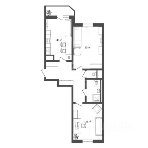 В квартире просторная кухня-гостиная 17 кв.м., с выходом на застекленную лоджию, две отдельные комнаты 13 и 14 кв.м., коридор 8 кв.м, санузел раздельный и кладовая (гардеробная) комната 2,7 кв.м.