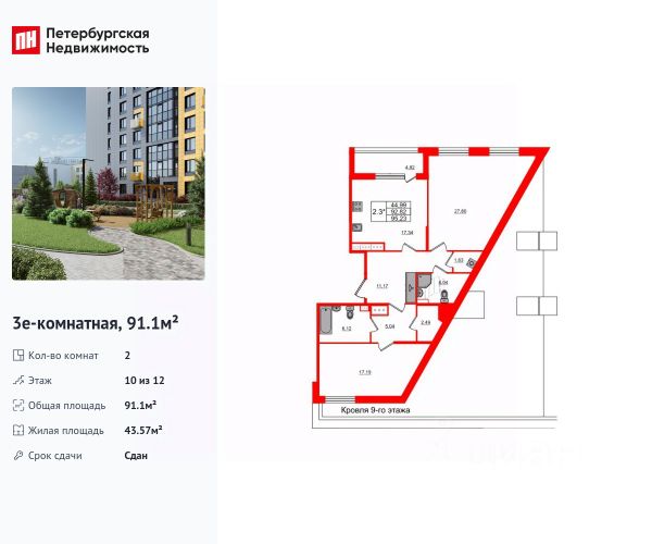 - С комнаты есть выход на ЗАСТЕКЛЕННЫЙ балкон (2.2 м²) с видом на Лахту, залив и парк 300-летия Петербурга
