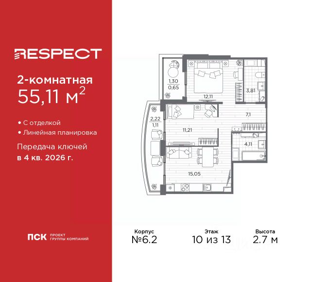 Двухкомнатная квартира от застройщика с предчистовой отделкой в ЖК "RESPECT" на 10 этаже. Общая площадь: 57.38 кв.м., жилая: 22.99 кв.м., площадь просторной кухни-столовой: 15.53 кв.м. Комнаты изолированные, все окна выходят на одну сторону. В квартире один балкон, один совмещенный и один раздельный санузел. Высота потолков 2.7 м. Дом монолитный, многоподъездный, переменной этажности, от 8 до 13 этажей. Квартира находится в 1-й секции высотой 13 этажей в корпусе 2. На этаже 5 квартир. В подъезде 1 пассажирский и 1 грузовой лифт. Окончание строительства - 1 квартал 2026 года. Оформление сделки по договору долевого участия. В шаговой доступности от жилого комплекса расположены станции метро (расстояние по прямой): "Лесная" (800 м), "Площадь Мужества" (1.4 км), "Выборгская" (1.9 км), также недалеко от этого корпуса расположены станции метро: "Академическая", "Политехническая". Жилой квартал "RESPECT" строится на Полюстровском пр, 87, в одной из самых востребованных локаций Петербурга. В 10 минутах пешком - метро "Лесная" и в 10 минутах на транспорте - Петроградская сторона. Высота домов от 7 до 13 этажей. Квартиры сдаются с отделкой white box и с чистовой отделкой. На территории Respect строится школа на 1125 учащихся и детский сад на 240 мест. Запроектированы собственная газовая котельная, закрытая территория, дворы без машин и подземные паркинги с лифтами. В проекте предусмотрены трапециевидные балконы или остекленные лоджии, которые, с одной стороны, исключают монотонность фасада, являясь декоративными элементами, с другой дополнительным функциональным пространством в квартирах. Цветовая гармония фасадов каждого дома раскрывает характер квартала. Коричневый цвет клинкерного кирпича со структурой водяных штрихов — цвет уюта и безопасности, сдержанности и надёжности. Вентилируемые фасады облицованы клинкерным кирпичом. Его высокая прочность позволяет давать 100 лет гарантии на этот материал. Водопоглощение клинкерного кирпича составляет менее 5%, за счет чего у него высокая теплопроводность и прочность. В квартале запроектированы внутренние закрытые территории дворов домов без доступа автомобилей и безбарьерная среда для велосипедистов и колясок. Предусмотрены IP-домофония с функцией дистанционного открывания калиток и парадных, а также дистанционный сбор показаний счетчиков и мобильное приложение для жителей. Для безопасности жителей квартала - круглосуточное видеонаблюдение и служба охраны. В каждой квартире предусмотрены внешние корзины для кондиционеров. Вся территория квартала будет связана единой концепцией благоустройства, разработанной ландшафтным бюро L.BURO. На эксплуатируемой кровле на уровне первого этажа в домах 1 и 4 будут обустроены общественные видовые террасы. Это станет не только привлекательным местом с красивым видом, но и удобным, многофункциональным пространством. Дизайн парадных зон и входных групп - сочетание лаконичности отделки и декоративных элементов с текстурами из натурального камня и дерева с п