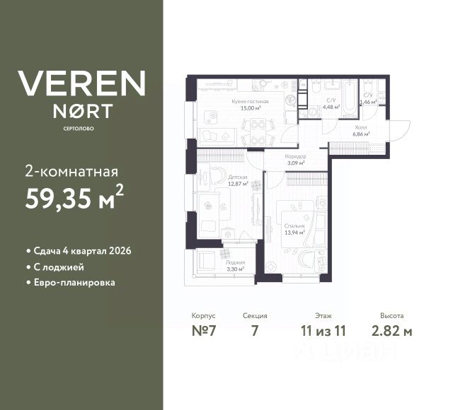 Успейте оформить бронирование, пока действует скидка! Предложение ограничено! Стоимость квартиры указана со скидкой, ваша экономия составит 4,801,649 RUB. По всем вопросам обращайтесь в офис продаж, наши менеджеры вам все расскажут! Продается 2-комн. квартира в Veren Nort Сертолово на 11 этаже. Квартира без отделки, новый собственник может сделать ремонт по индивидуальному дизайн-проекту. Общая площадь: 64.61 кв.м., жилая: 29.97 кв.м., площадь просторной куxни-гостиной: 18.72 кв.м. Комнаты изолированные, все окна выходят на одну сторону. В квартире один балкон, один совмещенный и один раздельный санузел. Высота потолков 2.82 м. Квартира находится в корпусе 4. Дом монолитный, одноподъездный, высотой 11 этажей. На этаже 14 квартир. В подъезде 1 пассажирский и 1 грузовой лифт. Начало строительства - 3 квартал 2023 года. Окончание строительства - 1 квартал 2026 года. Оформление сделки по договору долевого участия. С балконом, евро-планировка, вид на приватный двор. Сочетание современной архитектуры и отличной экологии севера Лен. области. Выразительный облик домов разработан именитым архитектурным бюро "Остоженка". Характеристики жилого комплекса исключительны: продуманный ландшафтный дизайн, оригинальные парадные, разработанные по индивидуальному дизайн-проекту, современные детские и многофункциональные спортивные площадки, летний кинотеатр под открытым небом, два детских сада. Комплекс создается в уже сложившейся инфраструктуре г. Сертолово и обладает удобным транспортным сообщением с Санкт-Петербургом. В 300 метрах от "VEREN NORT сертолово" планируется транспортно-пересадочный узел "Сертолово", который обеспечит удобную железнодорожную связь с Финляндским вокзалом Санкт-Петербурга. #ZMZSFZ