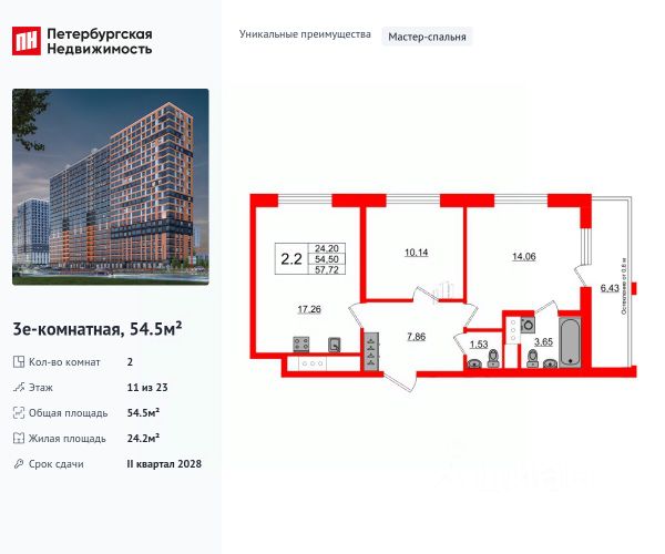 Строим кварталы для жизни с заботой о будущем. Предлагается 2-комнатная квартира комфорт-класса 55 кв.м в корпусе 39 на 11 этаже, в ЖК "Живи! В Рыбацком" Квартира с предчистовой отделкой. Доступность дополнительных опций уточняйте у застройщика. Приобрести квартиру возможно по специальным акциям от застройщика, с текущими условиями акций можно ознакомиться в блоке "Акций". Цена динамическая и может отличаться, уточняйте актуальность у застройщика. Квартал "Живи! В Рыбацком" в Невском районе Санкт-Петербурга расположен рядом с рекой Славянкой и парком. Всего 20 минут пешей прогулки — и вы у метро "Рыбацкое". Автомобилисты будут добираться до КАДа за десять минут. В квартале работают два детских сада, школа и кабинет врача. На первых этажах зданий открыты магазины, кафе и салоны красоты. Во дворе — зеленые бульвары, воркаут-площадка, спортивный и игровой кластеры. Для машин — подземный паркинг. Кирпично-монолитные дома с каменной облицовкой — воплощение долговечности и тепла. Есть в квартале и камерный 30-й корпус, в нем восемь этажей, 70 квартир и приватный двор-парк. В сквозных парадных — безбарьерная среда, помещения для хранения колясок и велосипедов и система видеонаблюдения.