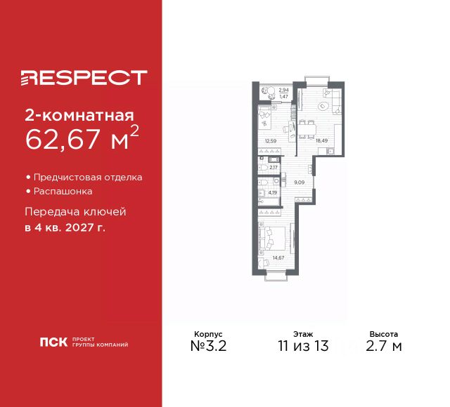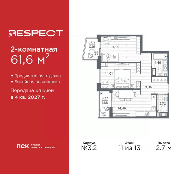Квартира находится в 17 этажном доме, в Аурум - Корпус 1(С1,С2,С3) на 11 этаже. Общая площадь квартиры 60,62 кв.м.