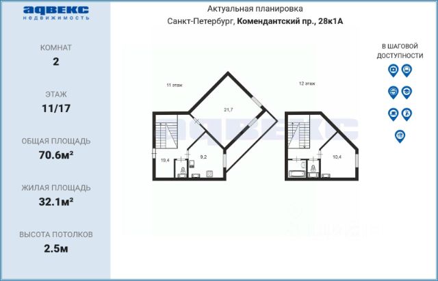 До станции метро Комендантский проспект 7 мин. на транспорте, до м. Пионерская 20 мин. на транспорте;