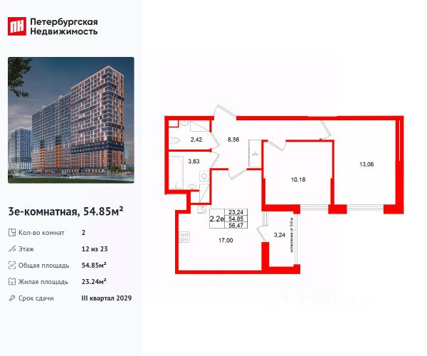 Продается уютная 2-комнатная квартира от застройщика в жилом комплексе "Город звезд" в новом городе на правом берегу Невы. До метро можно добраться на транспорте всего за 13 минут. Удобная, классическая, функциональная европланировка, большая кухня-гостиная 17 м², просторная прихожая 8.56 м². Общая площадь квартиры - 54.85 м², жилая 23.24 м², высота потолка 2.77 м. Квартира продается с отделкой "Норд Лайн серый". Что особенного в ЖК "Город звезд"? • Инновационный Лицей Setl с оригинальной архитектурной концепцией и уникальной образовательной средой • Невский лесопарк под окнами - всегда свежий воздух и полноценный отдых на природе • Четыре тематические площади отдыха с разнообразным благоустройством • Аллея Звёзд - променад протяженностью 5 км с ландшафтным озеленением, зонами отдыха и велодорожкой • Выход на набережную реки Утки, где можно порыбачить или взять напрокат лодку • Единая входная группа с ресепшен и подземный паркинг
