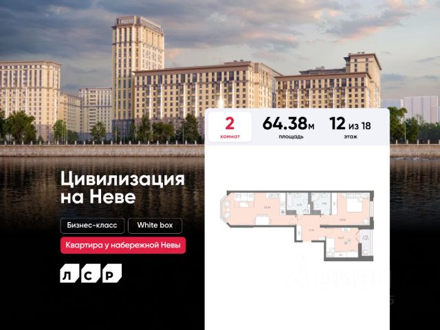 Цена действует при 100% оплате и на определенные ипотечные программы. Подробности — в отделе продаж по телефону. Продаётся 2-комнатная квартира в ЖК "Цивилизация на Неве" на 12 этаже. Общая площадь составляет 58.51 кв. м. Квартира с white box отделкой. Жилой комплекс "Цивилизация на Неве" располагается по адресу Санкт-Петербург, Невский. "Цивилизация на Неве" - видовые дома бизнес-класса, расположенные вдоль набережной Невы, всего в 7 км от исторического центра. Жилой комплекс идеально выражает особый дух, свойственный знаменитым просторным кварталам постройки сталинской эпохи в Москве и на Московском проспекте в Петербурге. Расположение: • 15 мин на авто до Невского проспекта; • 15 мин на авто до Московского вокзала; • 5 мин на авто до станции метро "Улица Дыбенко"; • 14 мин (7 км) до КАД. Уникальный дизайн входных зон, закрытая территория, видеонаблюдение и охрана, подземный паркинг с лифтом и другие особенности проекта отвечают заявленному классу. В каждом дворе предусмотрено озеленение по индивидуальному ландшафтному проекту с благородными растениями и кустарниками. Преимущества: • Закрытая территория с видеонаблюдением; • Подземный паркинг с лифтом; • Детская площадка на приватной безопасной территории; • Несколько детских садов и школ; • Инфраструктура шаговой доступности на первых этажах корпусов. Успейте приобрести квартиру на выгодных условиях! Чтобы узнать подробности, обращайтесь за консультацией по телефону.