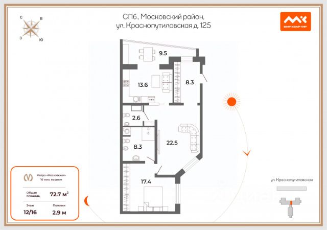 Продаётся 2к.кв. в ЖК Cube от застройщика Холдинг "РСТИ" (Росстройинвест). Квартира находится в 18 этажном доме, в Корпус 5-Cube на 12 этаже. Общая площадь квартиры 71,80 кв.м. Cube — новый жилой комплекс в Московском районе Санкт-Петербурга. Сочетает в себе все возможные преимущества — от удачного расположения и развитой инфраструктуры до благоустроенной территории и эргономичных планировок. В состав проекта входят пять корпусов переменной этажности (от 12 до 18 этажей). Придомовая территория будет свободна от машин, обеспечена видеонаблюдением и системой контроля доступа. Для жильцов предусмотрен подземный паркинг, для гостей — наземная парковка. Во дворах появятся детские площадки — отдельно для малышей и для детей постарше, места для отдыха, где можно будет посидеть в беседке. На территории предусмотрен детский сад на 100 мест. Для удобства жильцов вход в подъезд находится на уровне земли. На первых этажах спроектированы колясочные; во всех подъездах будут установлены скоростные бесшумные лифты. Инфраструктура района хорошо развита: рядом есть супермаркеты, школы, детские сады, спортивные центры, больницы. В 2 км выезды на КАД и ЗСД, за 10 минут можно доехать до станции метро "Московская" или до гипермаркетов и торгово-развлекательных комплексов на Пулковском шоссе. Еще одно преимущество расположения Cube — близость к паркам: в 2 км от комплекса находятся Пулковский парк, парки Победы и Авиаторов. Здесь проходят праздничные мероприятия и гуляния. От комплекса за полчаса можно доехать на машине до Павловска, Пушкина, Петергофа, чтобы погулять и сходить на экскурсии. Купить продукты, выпить кофе можно будет и на территории комплекса Cube: магазины, кафе, службы сервиса откроются на первых этажах домов. Фасады жилого комплекса Cube выполнены из керамогранита серого, графитового и медного цветов. Расположение корпусов формирует два закрытых благоустроенных двора с детскими площадками и зонами для отдыха.