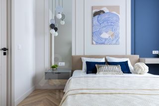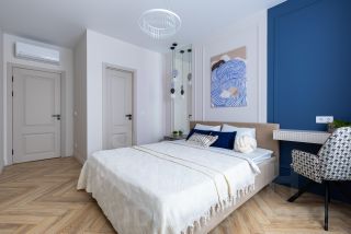 -Корпусная мебель в остальных помещениях также сделана на заказ, во влажных помещениях фасады выполнены в эмали. Все шкафы оснащены подсветкой, в мастер спальне и детской дополнительными аксессуарами (брючницы, ящик для хранения очков/украшений/ремней); вся фурнитура с доводчиками. В детской продумана большая рабочая зона с большим количеством розеток, место для стационарного компьютера и хранения книг/учебников. Сделано усиленное точечное освещение над рабочим столом.