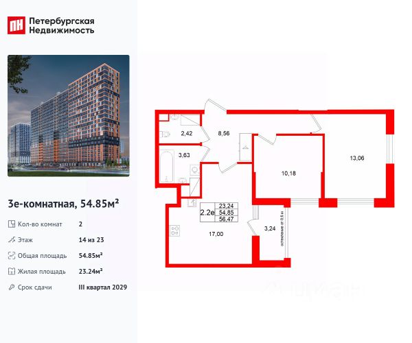 * Общая площадь - 55,2 м2;