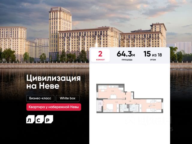 Продаётся 2-комнатная квартира в ЖК "Цивилизация на Неве" на 15 этаже. Общая площадь составляет 43.03 кв. м. Квартира с white box отделкой. Жилой комплекс "Цивилизация на Неве" располагается по адресу Санкт-Петербург, Невский. "Цивилизация на Неве" - видовые дома бизнес-класса, расположенные вдоль набережной Невы, всего в 7 км от исторического центра. Жилой комплекс идеально выражает особый дух, свойственный знаменитым просторным кварталам постройки сталинской эпохи в Москве и на Московском проспекте в Петербурге. Расположение: • 15 мин на авто до Невского проспекта; • 15 мин на авто до Московского вокзала; • 5 мин на авто до станции метро "Улица Дыбенко"; • 14 мин (7 км) до КАД. Уникальный дизайн входных зон, закрытая территория, видеонаблюдение и охрана, подземный паркинг с лифтом и другие особенности проекта отвечают заявленному классу. В каждом дворе предусмотрено озеленение по индивидуальному ландшафтному проекту с благородными растениями и кустарниками. Преимущества: • Закрытая территория с видеонаблюдением; • Подземный паркинг с лифтом; • Детская площадка на приватной безопасной территории; • Несколько детских садов и школ; • Инфраструктура шаговой доступности на первых этажах корпусов. Успейте приобрести квартиру на выгодных условиях! Чтобы узнать подробности, обращайтесь за консультацией по телефону.
