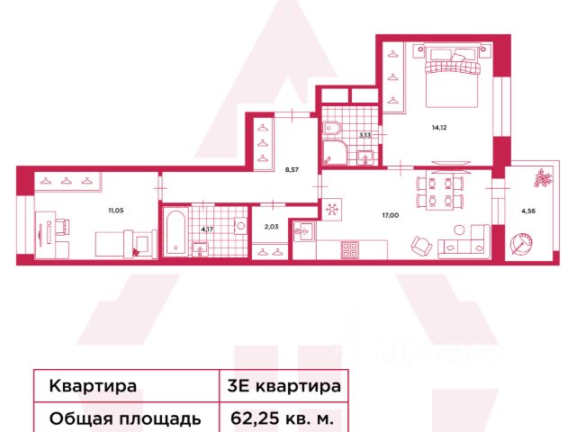 Площадь: 53,1 кв. м. С учетом лоджии площадь составляет 62,1 кв.м.