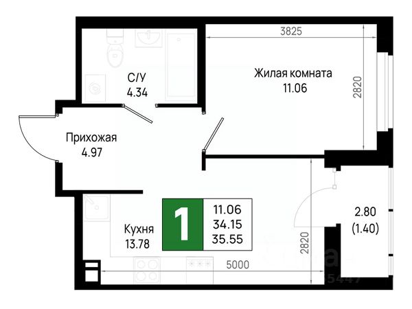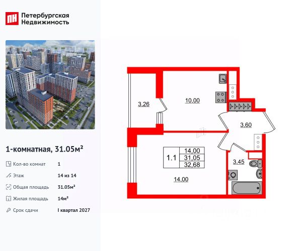 Общая площадь квартиры составляет 31,77 м.