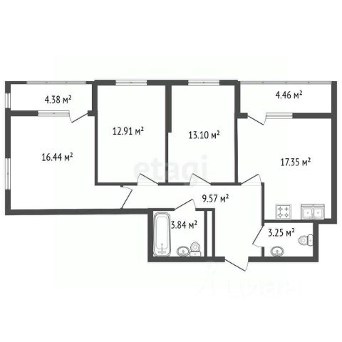 Потолки: натяжные в прихожей, комнатах и санузле; на лоджии окрашенная монолитная плита.