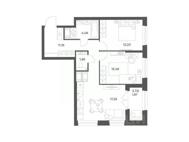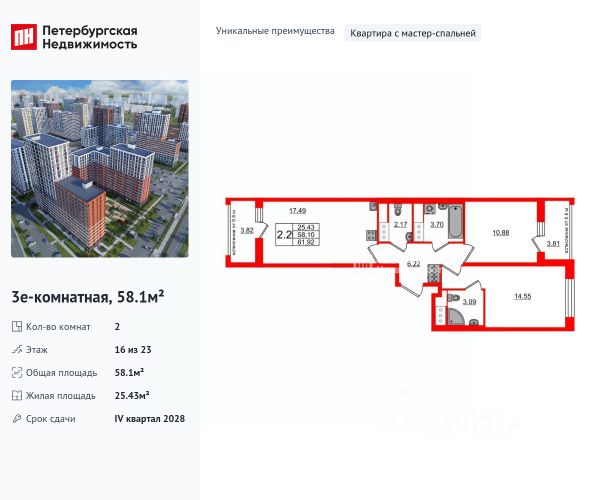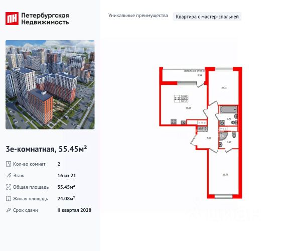 Продается уютная 2-комнатная квартира от застройщика в жилом комплексе "Город звезд" в новом городе на правом берегу Невы. До метро можно добраться на транспорте всего за 13 минут. Мастер-спальня с собственной ванной комнатой. Самое приватное пространство в вашей квартире. Уникальная, функциональная европланировка, большая кухня-гостиная 17.16 м², вместительная прихожая 6.11 м². Общая площадь квартиры - 53.06 м², жилая 22.77 м², высота потолка 2.77 м. Квартира продается с отделкой "Норд Лайн серый". Что особенного в ЖК "Город звезд"? • Инновационный Лицей Setl с оригинальной архитектурной концепцией и уникальной образовательной средой • Четыре тематические площади отдыха с разнообразным благоустройством • Аллея Звёзд - променад протяженностью 5 км с ландшафтным озеленением, зонами отдыха и велодорожкой • Выход на набережную реки Утки, где можно порыбачить или взять напрокат лодку • Единая входная группа с ресепшен и подземный паркинг • Невский лесопарк под окнами - всегда свежий воздух и полноценный отдых на природе