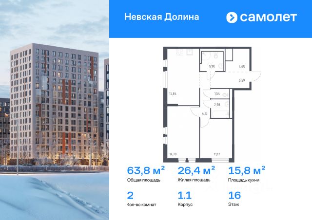 В продаже 2-комнатная квартира в корпусе 1.1 ЖК 'Невская Долина'. Квартира располагается на 16 этаже, общая площадь 63.77 м2.