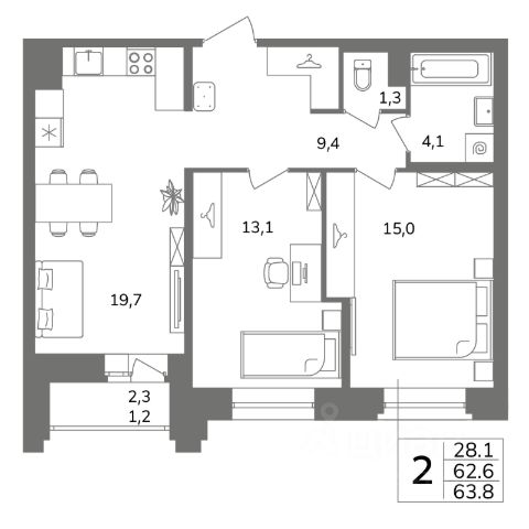 2-комн. квартира от застройщика с отделкой в ЖК "PLUS Пулковский" на 2 этаже. Общая площадь: 58.9 кв.м., жилая: 28.1 кв.м., площадь просторной кухни-столовой: 15.9 кв.м. Квартира - распашонка, без проходных комнат, окна выходят на paзные стороны дома. В квартире одна лоджия, один совмещенный и один раздельный санузел. Высота потолков 2.89 м.