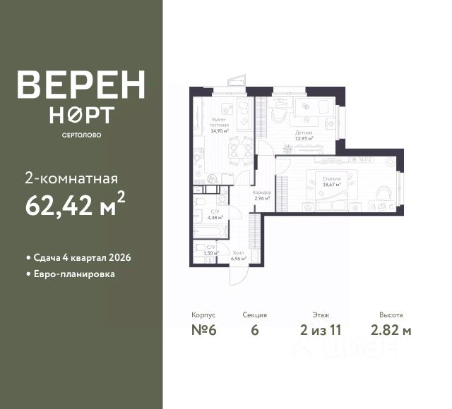 Двухкомнатная квартира от застройщика с предчистовой отделкой в ЖК "Сезоны" на 2 этаже. Общая площадь: 54.34 кв.м., жилая: 23.54 кв.м., площадь просторной кухни-столовой: 17.09 кв.м. Квартира угловая, идеально подойдет любителям тишины и панорамных видов. В квартире один балкон, два совмещенных санузла. Высота потолков 2.88 м. Дом монолитный, многоподъездный, высотой 7 этажей. Квартира находится в 1-й секции в корпусе 611. На этаже 4 квартиры. В подъезде 1 грузовой лифт. Начало строительства - 4 квартал 2025 года. Окончание строительства - 2 квартал 2028 года. Оформление сделки по договору долевого участия. Видовой жилой комплекс "Сезоны" от ГК ПСК возводится в одном из самых востребованных и престижных районов Санкт-Петербурга - Приморском, рядом с Суздальским и Выборгским шоссе. Такое расположение обеспечивает удобный выезд в разные части города, сочетая городской комфорт с близостью к природе. Всего в 50 метрах находится природный заказник "Новоорловский" и речка Каменка, а в пешей доступности - Суздальские озёра. Приморский район отличается развитой социальной и транспортной инфраструктурой. Здесь расположены крупные торговые и деловые центры, современные спортивные объекты, медицинские учреждения, магазины, кафе и рестораны. Комплекс включает четыре корпуса, ввод которых в эксплуатацию запланирован на 2028 год. Проект и прилегающий микрорайон разработаны в соответствии с концепцией "15-минутного города", при которой вся необходимая инфраструктура находится в шаговой доступности. В ближайшем окружении - две школы, пять детских садов, магазины, кафе, салоны красоты, банковские отделения и пункты выдачи заказов. Также предусмотрены два четырёхъярусных паркинга с лифтами на 288 машиномест. О застройщике ГК ПСК - один из крупнейших девелоперов Санкт-Петербурга с более чем 18-летней историей. Компания реализует проекты во всех сегментах недвижимости - от премиальных жилых комплексов до масштабных кварталов комфорт-класса и апарт-отелей. По данным портала ЕРЗ.РФ, ПСК входит в ТОП-3 крупнейших застройщиков Санкт-Петербурга по объёму текущего строительства. Портфель компании превышает 3 млн кв. м жилой и коммерческой недвижимости. Все объекты сдаются строго в срок и отличаются высоким уровнем архитектурных и инженерных решений. #ztOouA